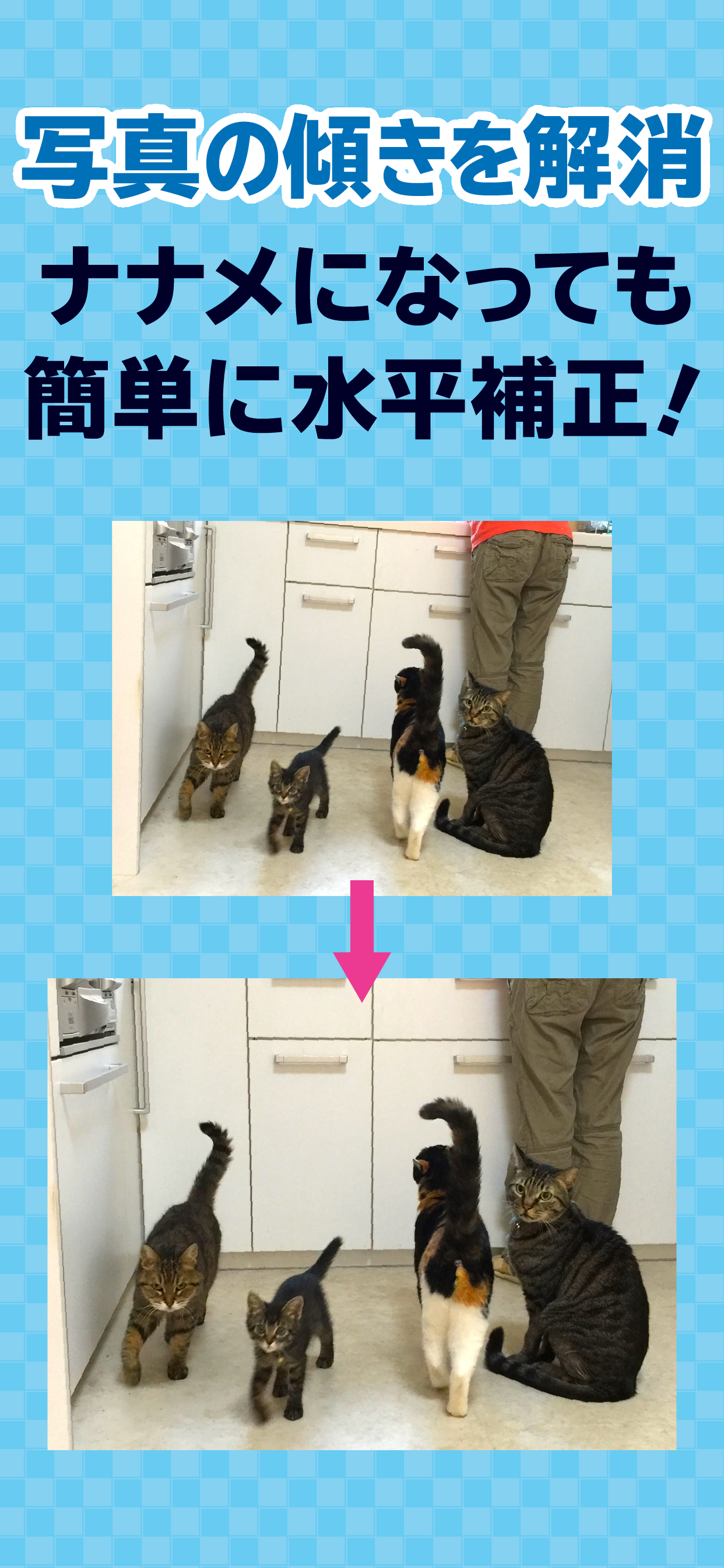 良い表情が撮れたと思ったのに景色が傾いてしまって構図がイマイチ、ということありますよね? 「撮る猫」の「自動水平補正機能」を使えば、撮影後でも 地面に対して水平になるように画像を補正 できます。